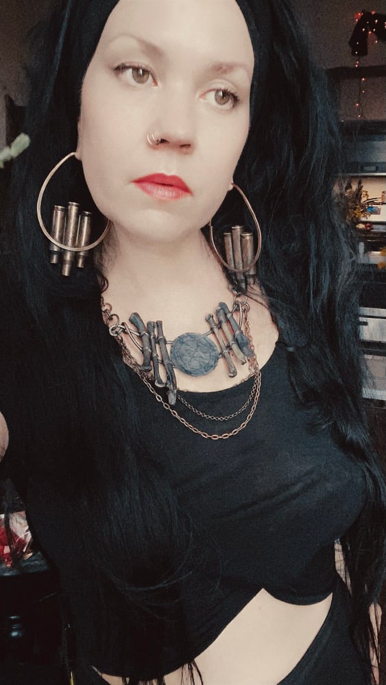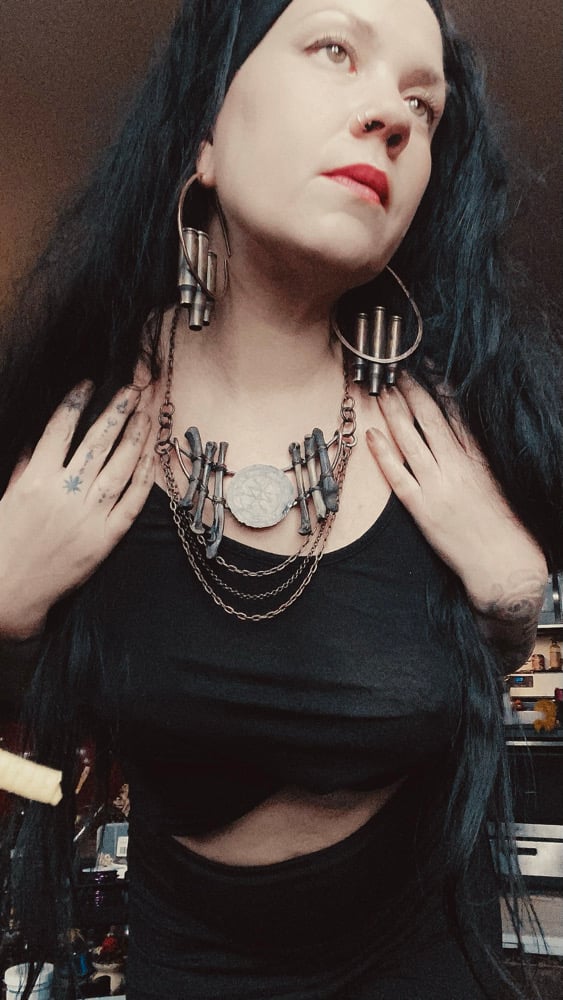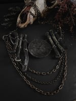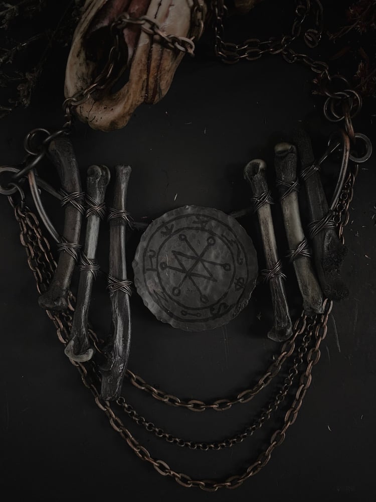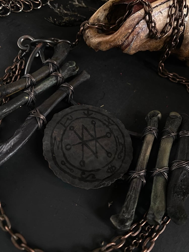 Hammered copper with various roadkill and copper chain. Hand painted sigil. This piece has a longer chain so it can be worn long or short choker style.