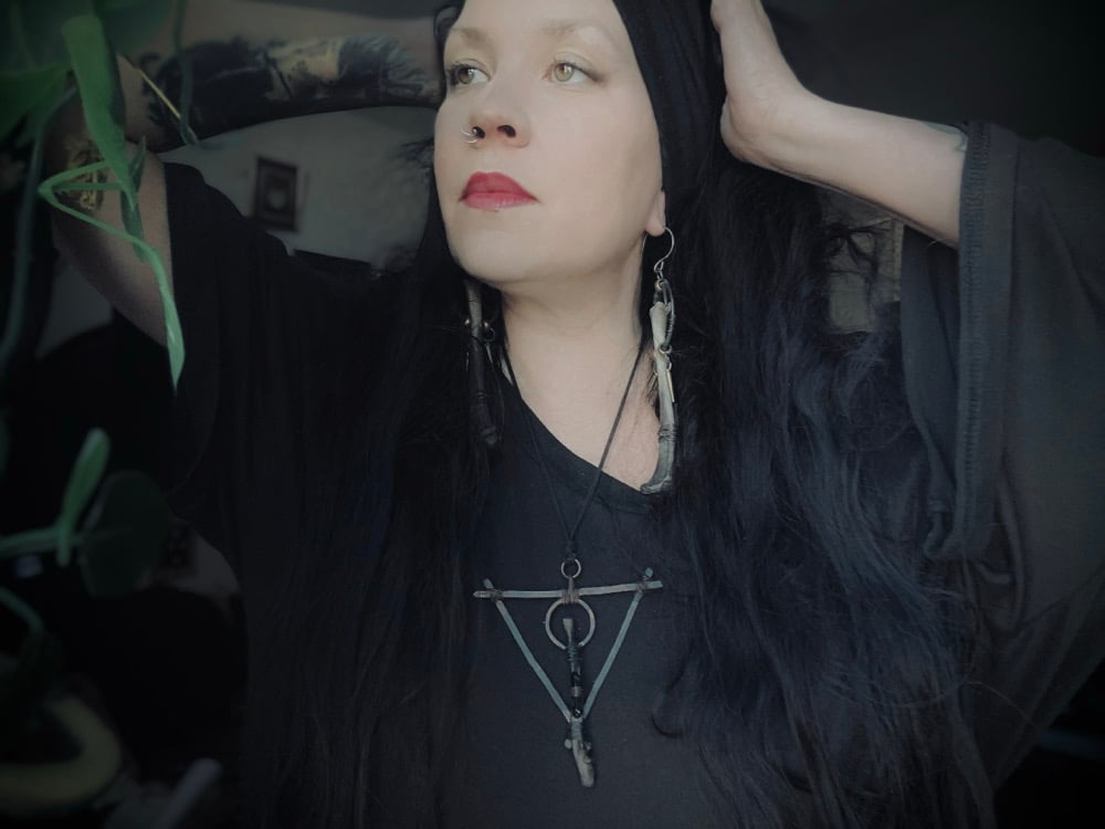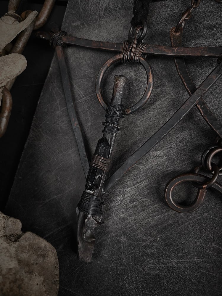 Forged copper with roadkill bone and titanium black quartz, extra long suede cording
