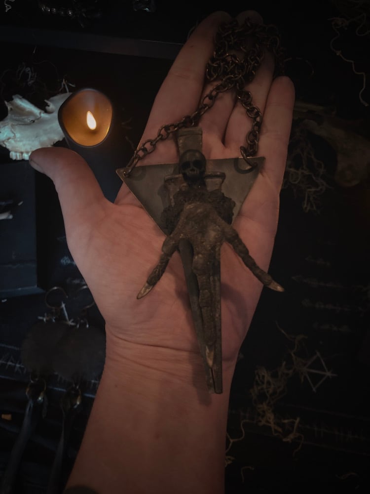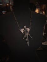Made from raw sheet copper with three antique coffin nails, and a pheasant foot. Hung from thick copper chain.