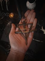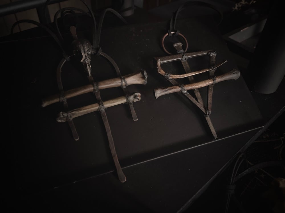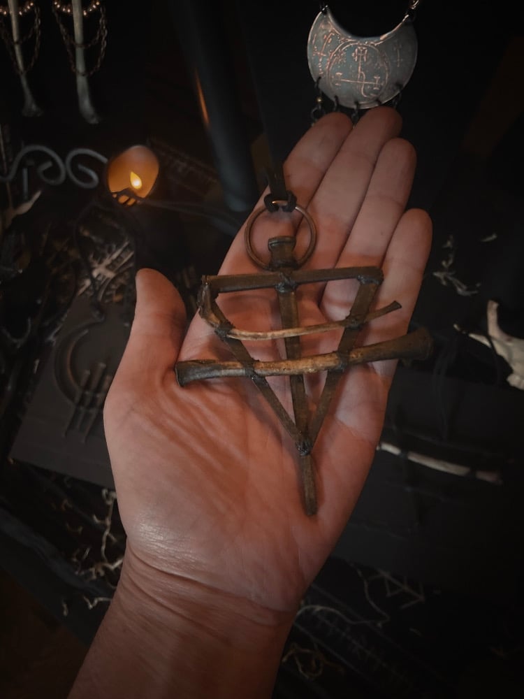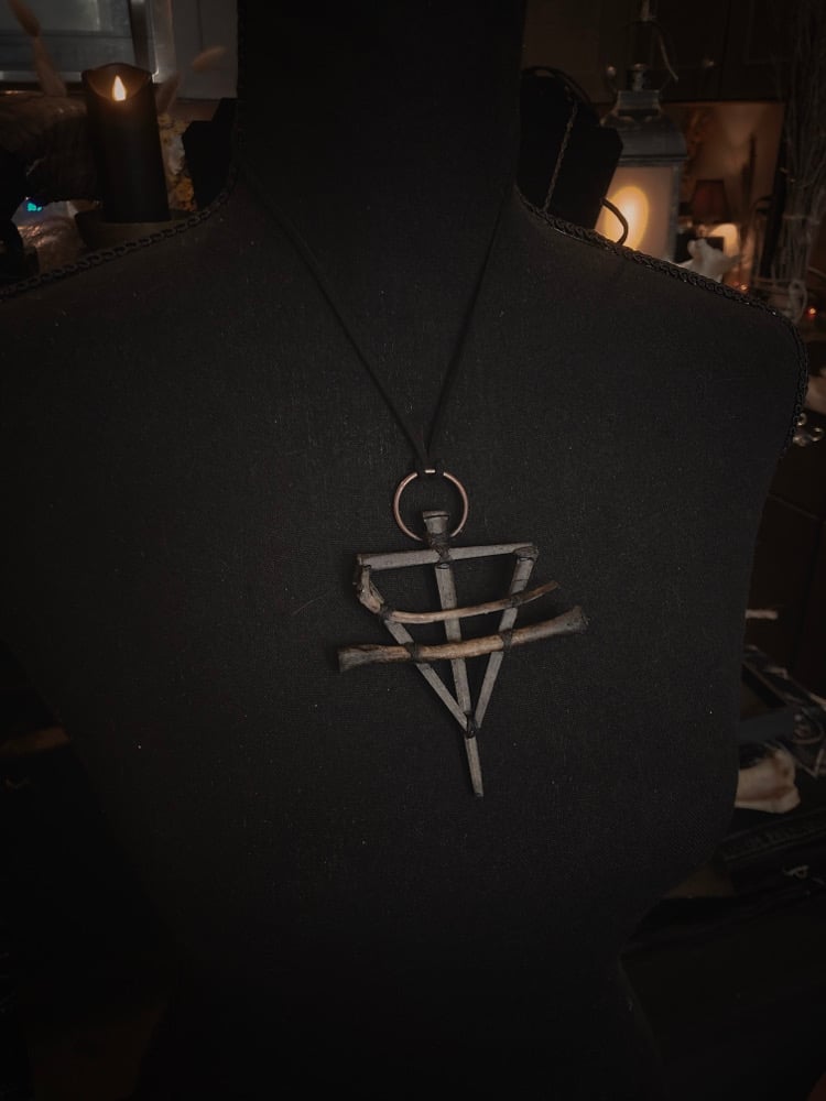 Made from antique coffin nail with roadkill bones. Hung from extra long cording