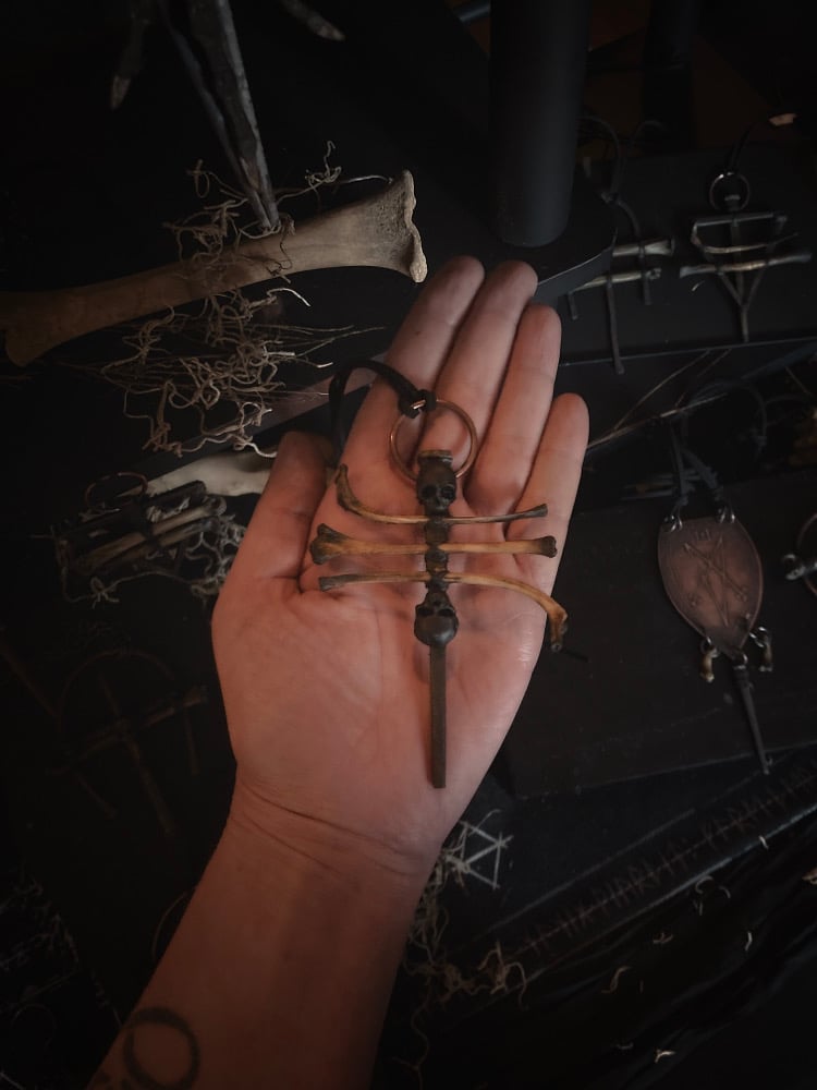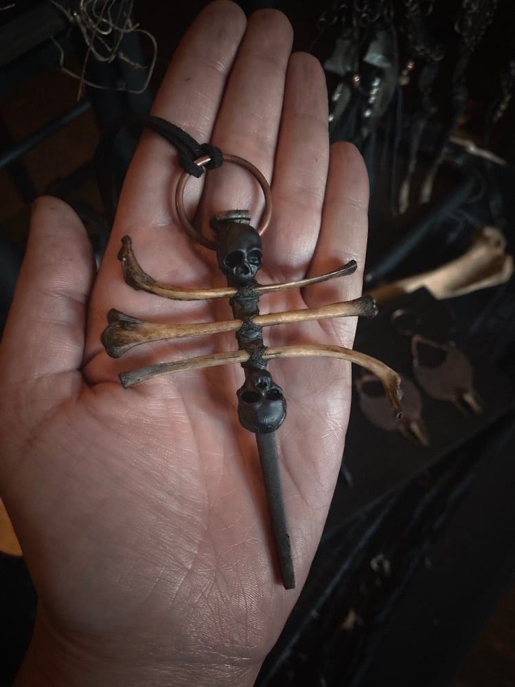 Made from roadkill bones and a large antique coffin nail with skulls. Hung from extra long cording.