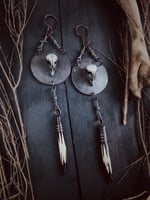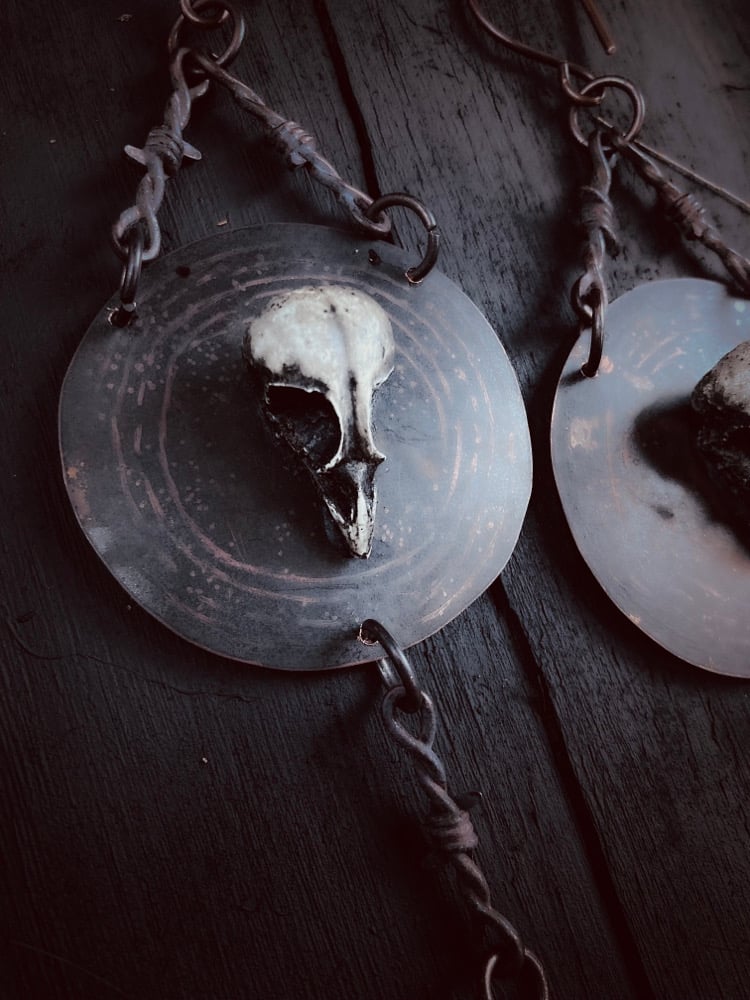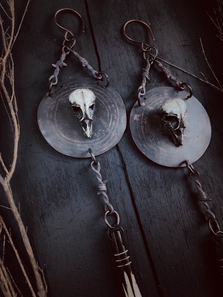 Hand cut copper with etched design, cast bird skulls, with barbed wire links and batik bone. These weigh 23 grams a piece with 14 gauge copper hooks