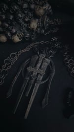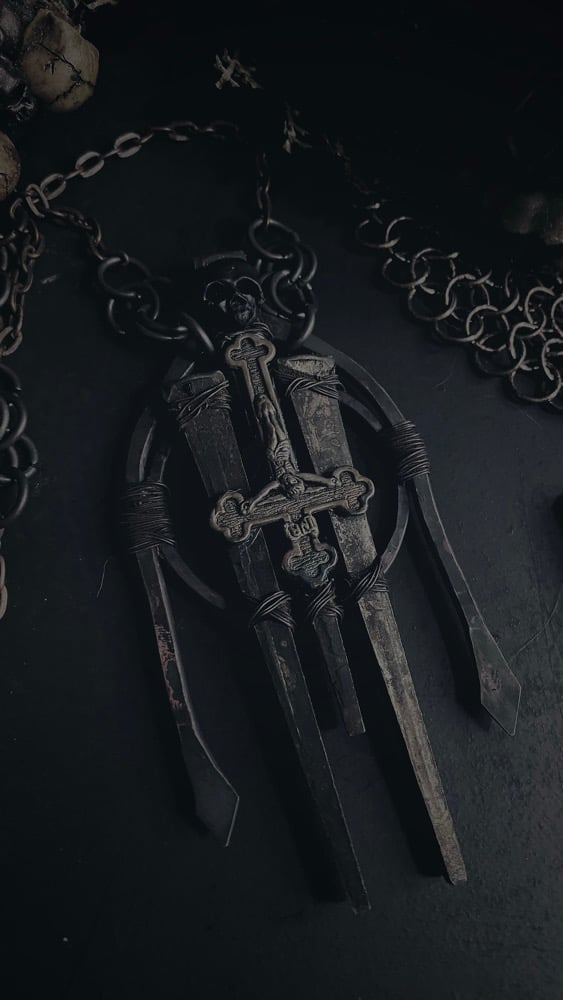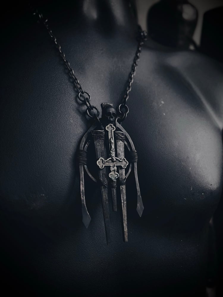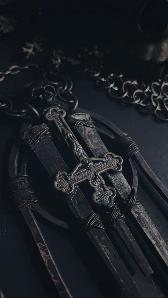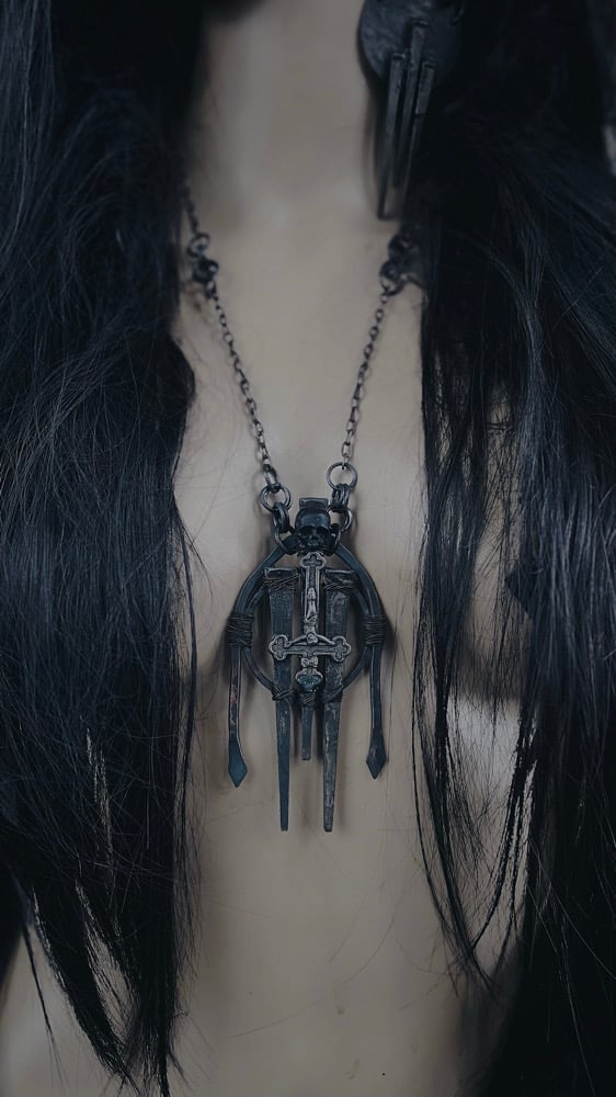 Hammered thick copper wire with antique coffin nails and inverted cross, this piece is heavy and solid. Extra long copper chain can be worn long or short.