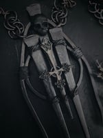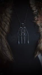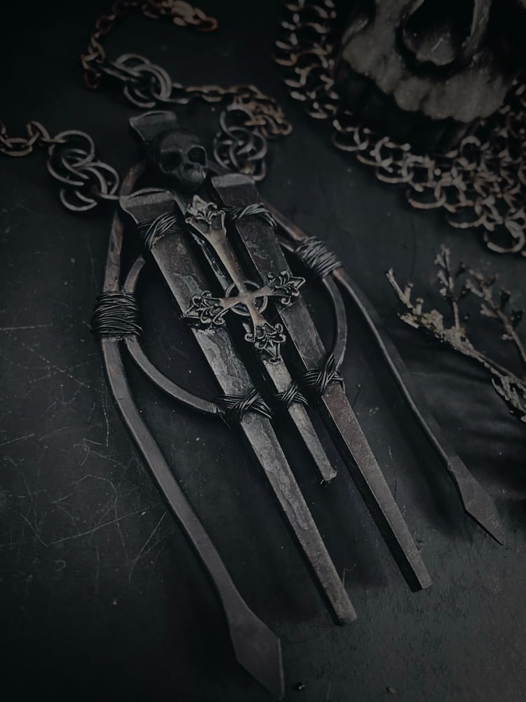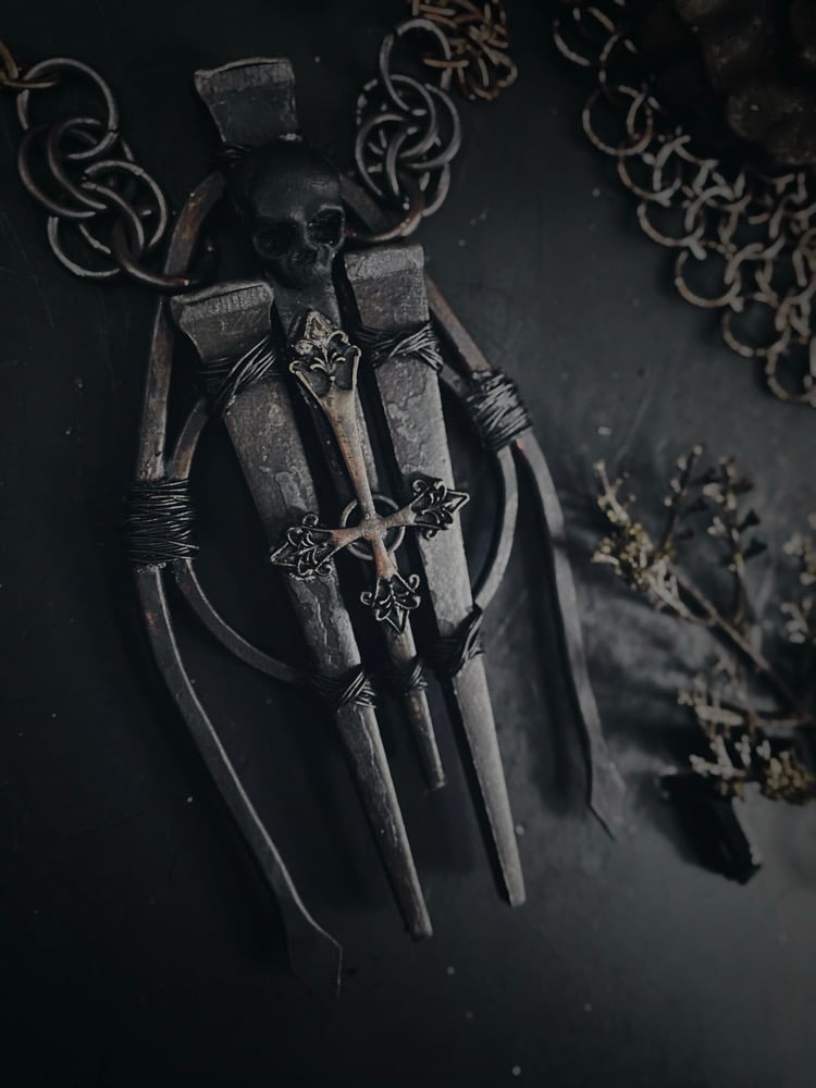 This piece is heavy and solid! Hand forged and hammered copper with antique coffin nails and blackened silver inverted cross. Extra long copper chain can be worn long or short.