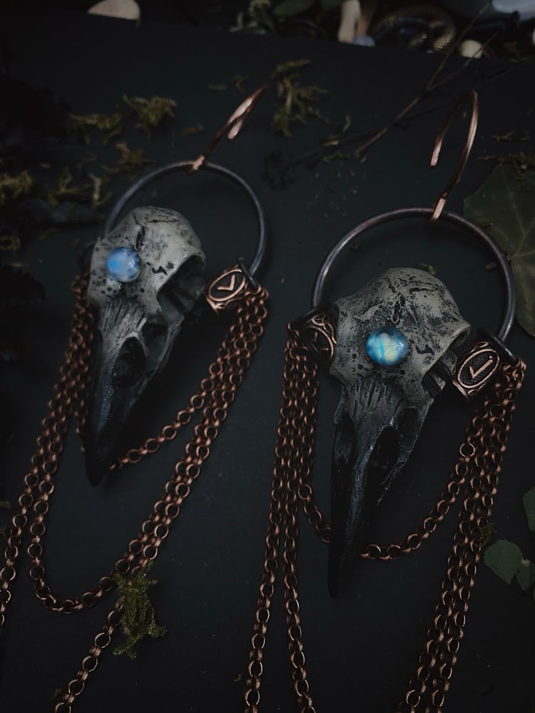 Cast crow skulls with moonstones and copper rune beads. These weigh 30g a piece with 14 gauge hooks, can swap out for regular