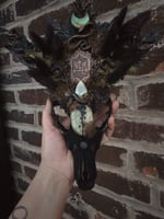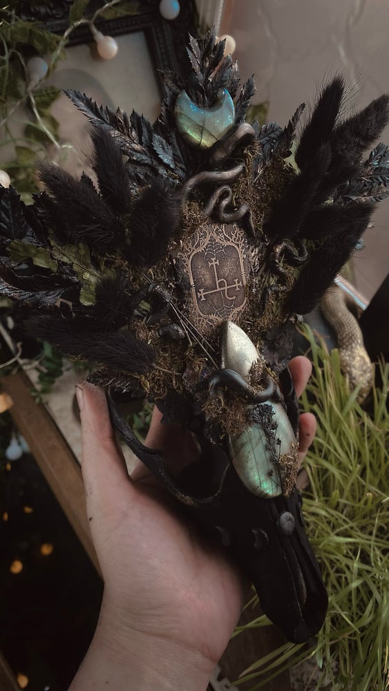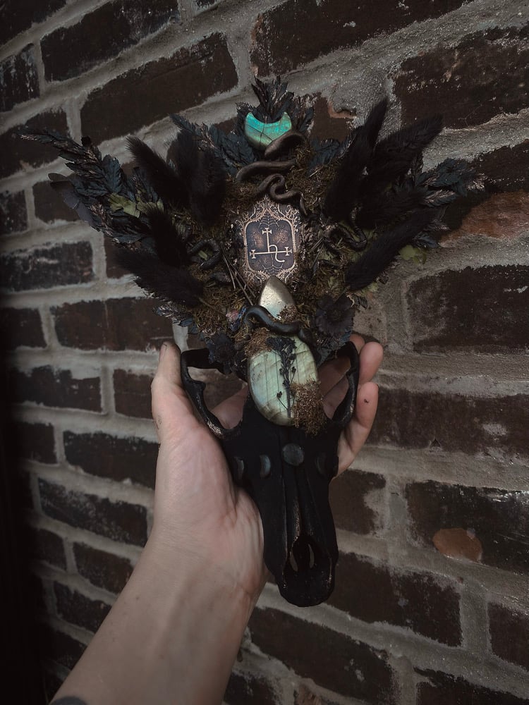This is such a statement piece for your alter (or wedding?). Salvaged Coyote skull in the darkest black with velvety finish. With a huge green labradorite, pyrite, rainbow kyanite, and a crescent moon labradorite. The crown i made from copper sheet metal. Sculpted snakes and an acid etched sigil of Lilith copper medallion. All leaves are natural and sealed but they are still a bit fragile so it’s important to handle this piece with care.