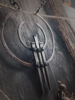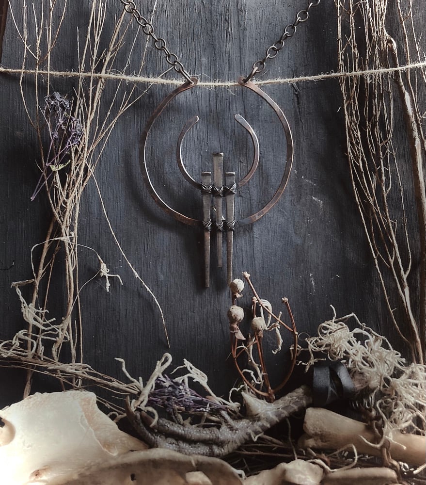 Hammered copper wire with antique coffin nails , hung from chain & cord