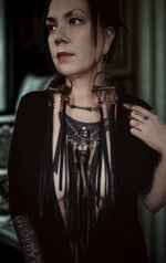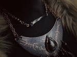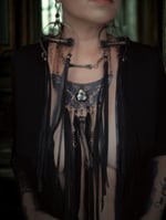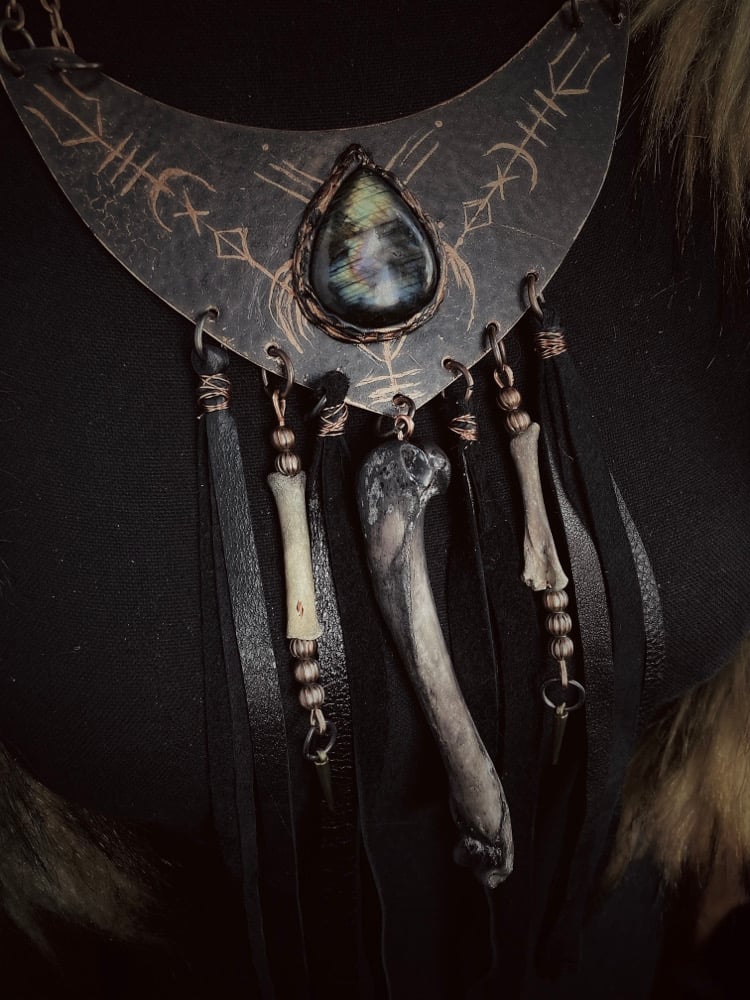 hand cut copper with hand painted detail and a gorgeous multi labradorite, roadkill bones and upcycled leather. This piece is weighty and makes a powerful statement