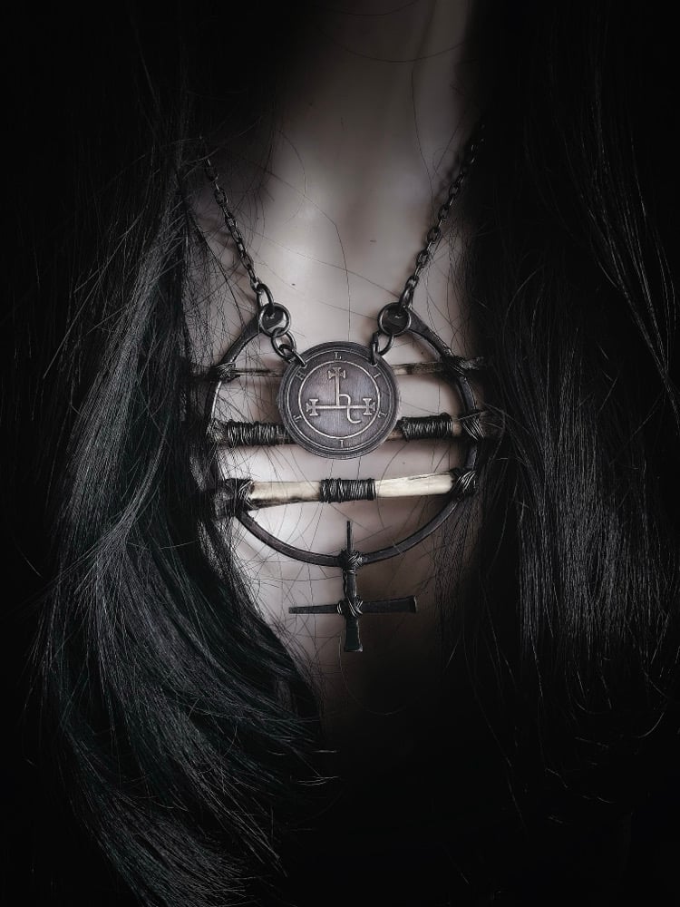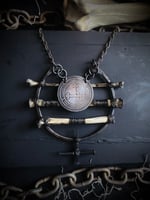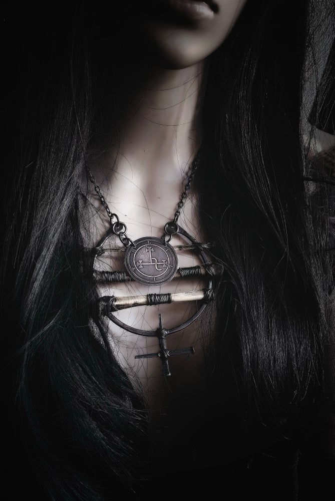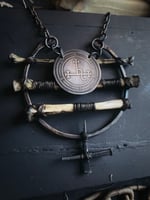 Hammered 8 gauge copper wire with antique coffin nails, road kill bones (unknown), and acid etched on copper Lilith sigil. Copper chain with lobster claw clasp.