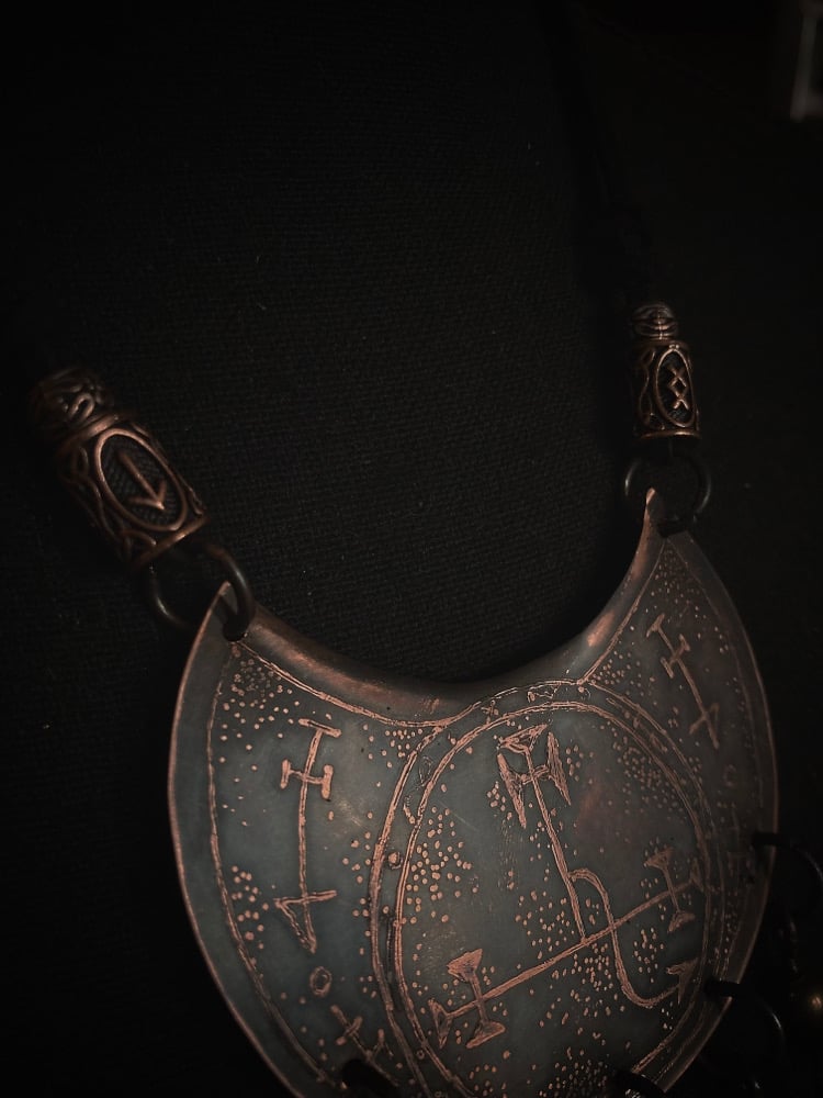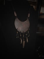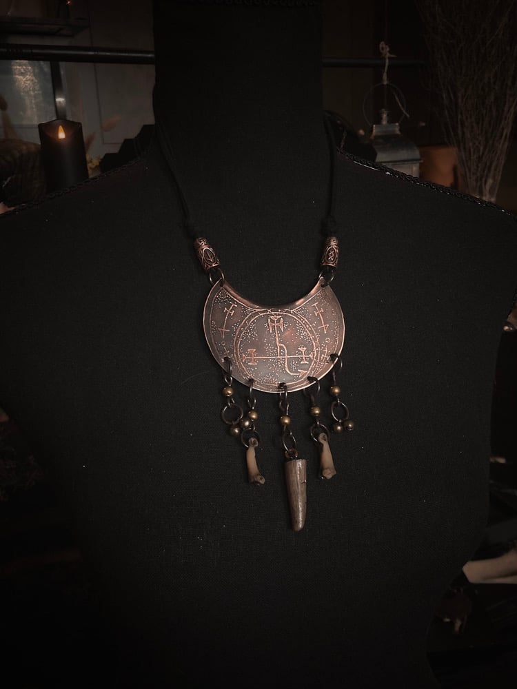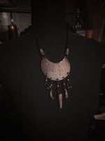 Cut from 28 gauge copper, hand drawn and acid etched, with antler tip, roadkill bones, and brass beads