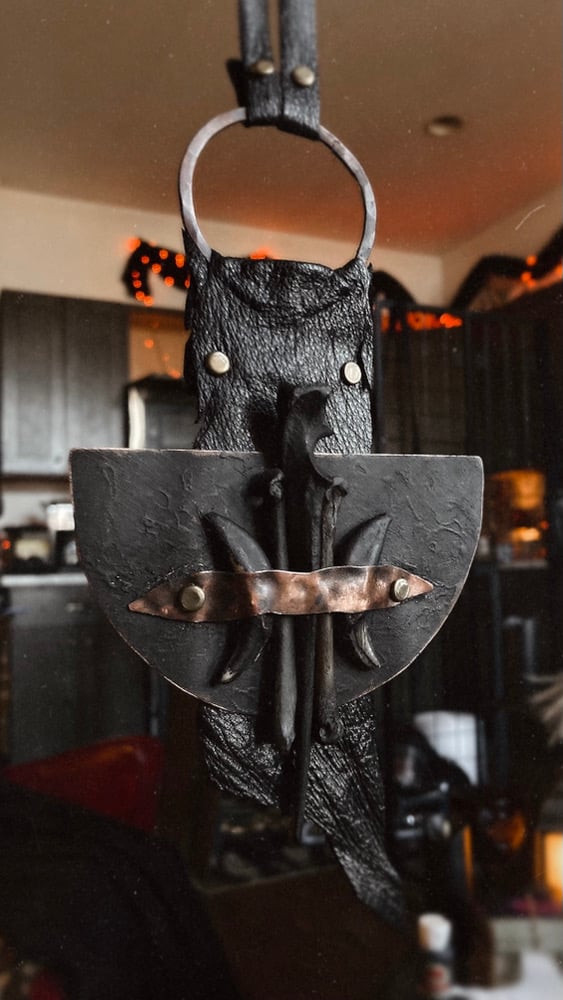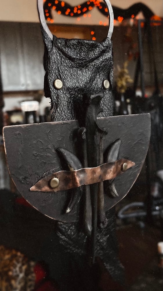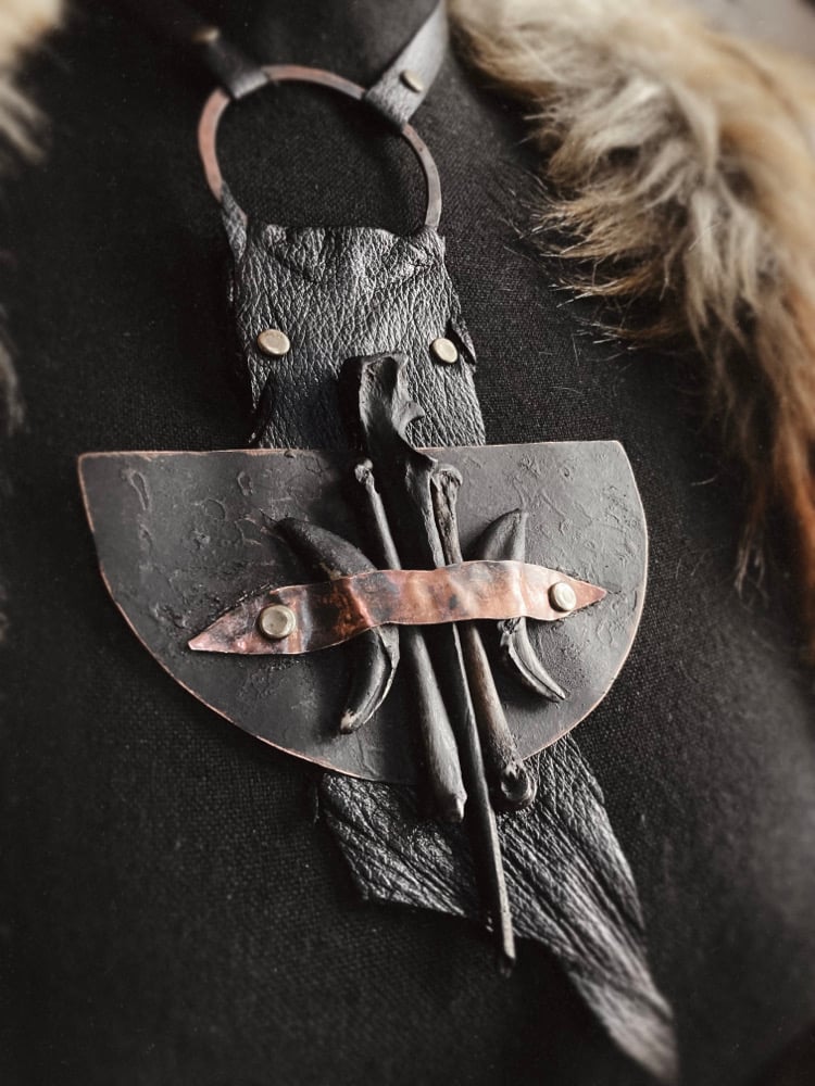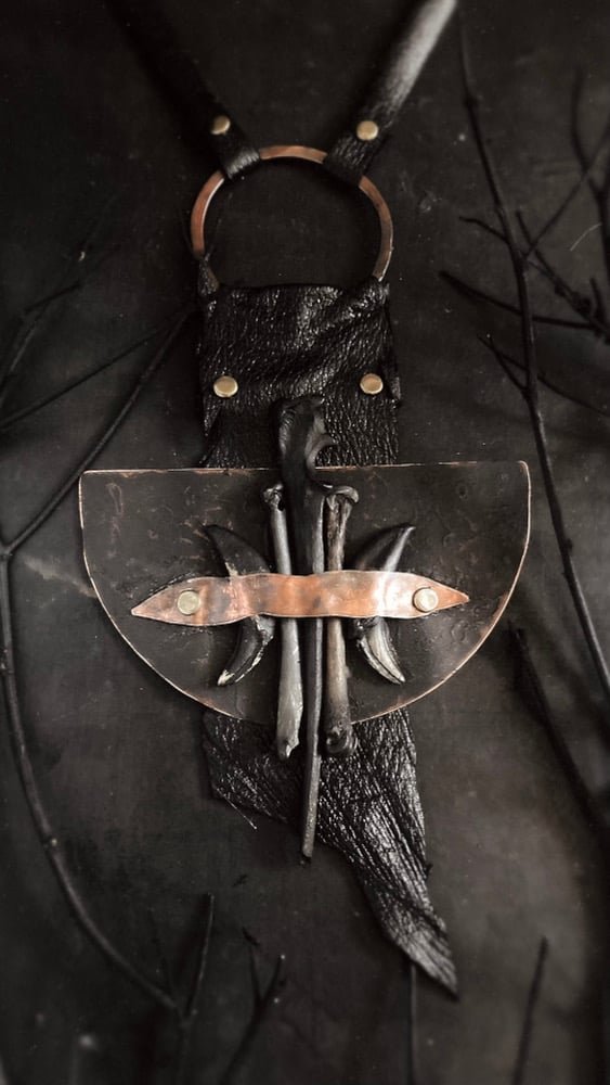 Copper with various bones (gifted & roadkill) and upcycled leather, this piece ties in the back to wear at different lengths.