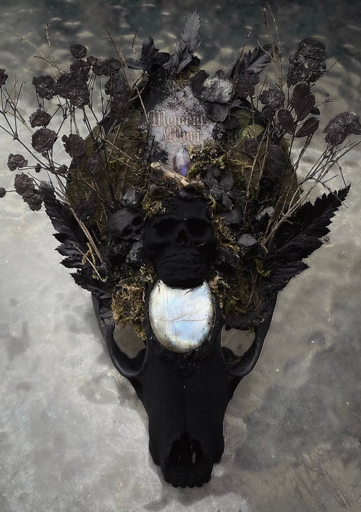 Adorned salvaged raccoon skull with an etched copper tombstone, moonstone, labradorite, raw chunks of Smokey quartz, natural dried leaves/flowers, moss, and graveyard dirt with genuine coyote toe bones. This piece can be an alter piece or just a trinket.