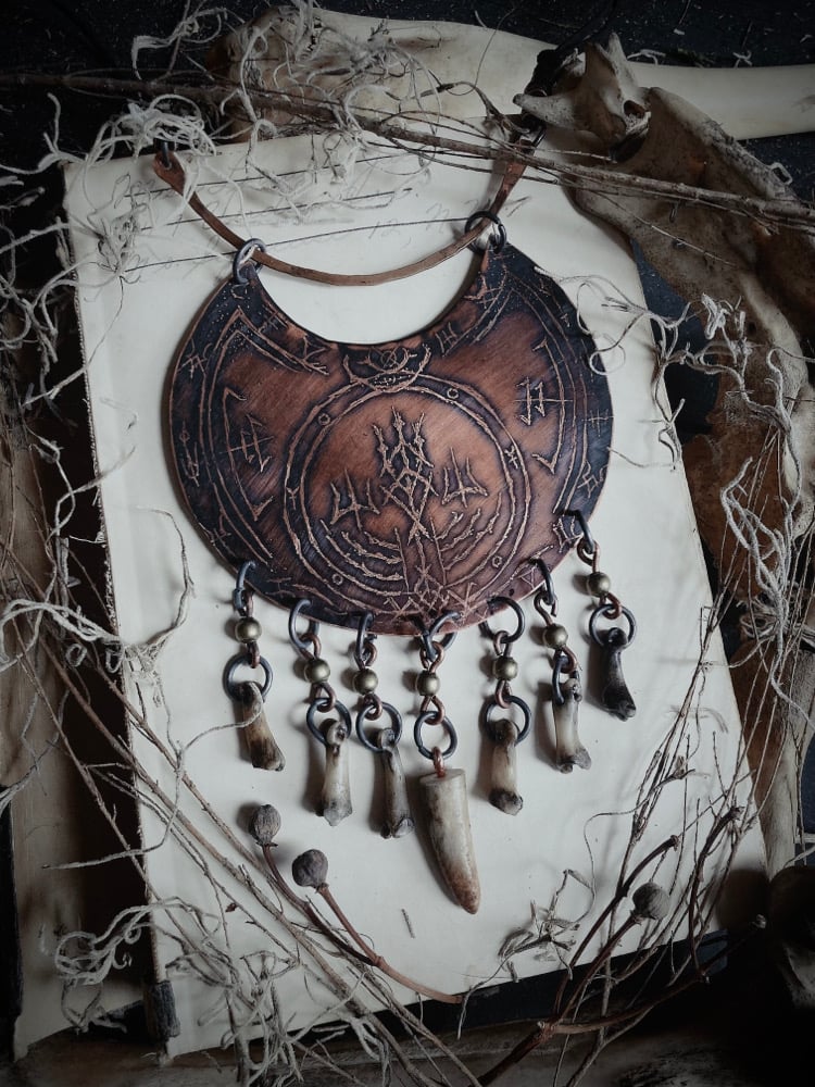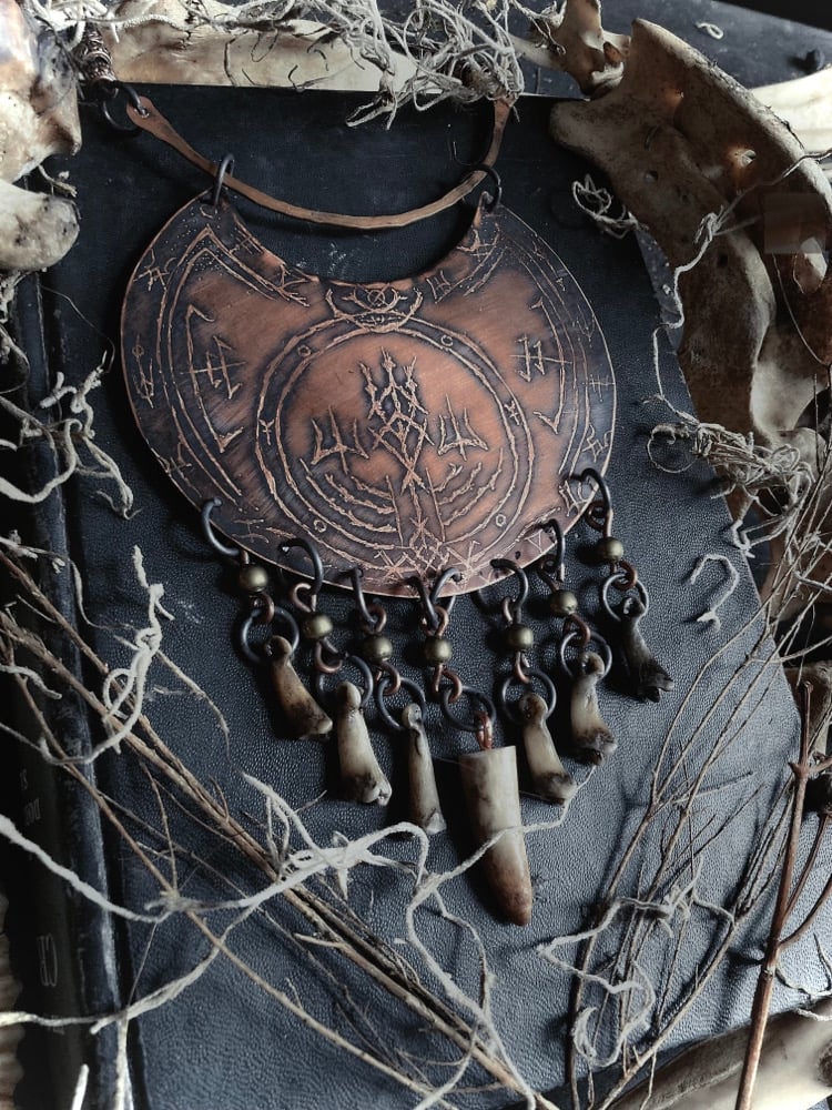 Cut from 24g copper sheet metal, I freehand drew and etched this piece with lil coyote bones and an antler tip. She measures a little over 4” wide.