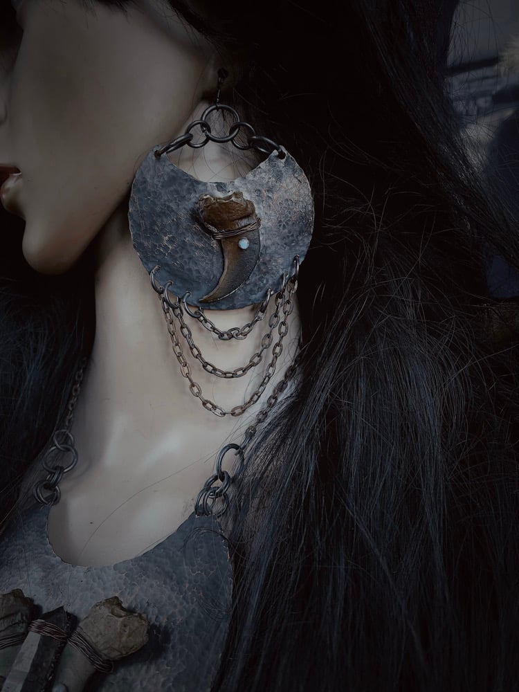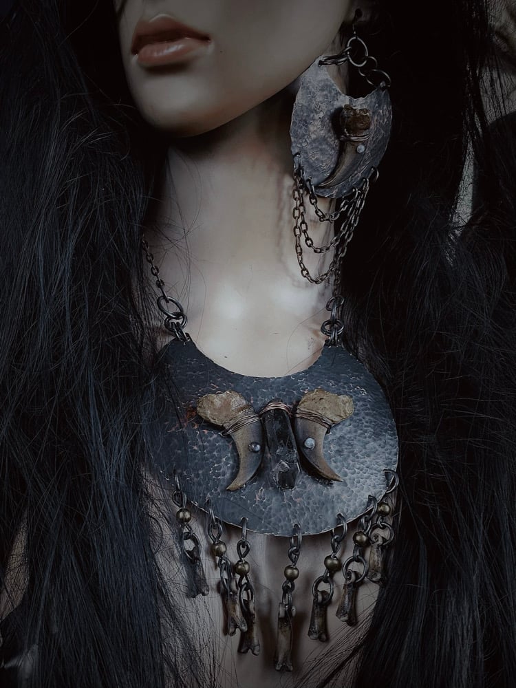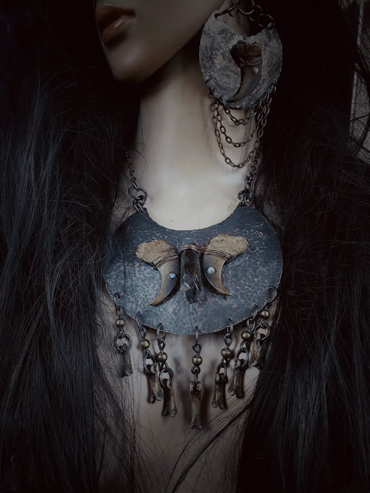 Hammered copper statement necklace, with cast bear claws, moonstones, and quartz, with coyote toe bones.