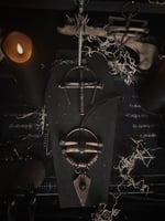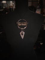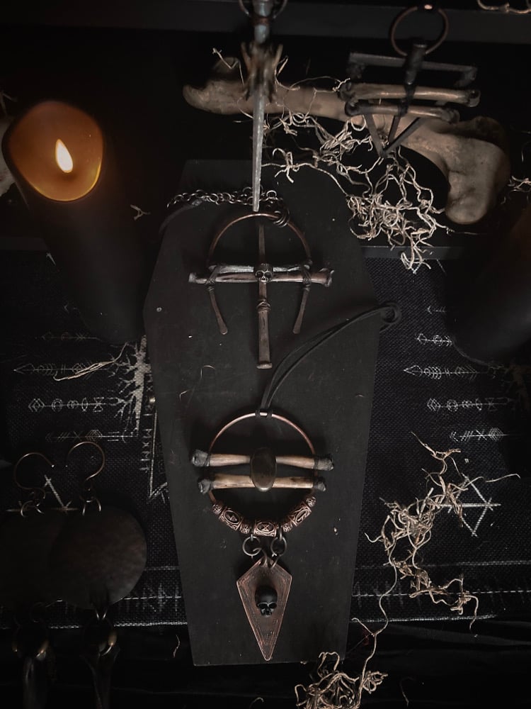 Made from copper wire with roadkill bones, a beautiful pyrite cabochon, Viking beads, and copper skull medallion. Hung from extra long cording.