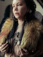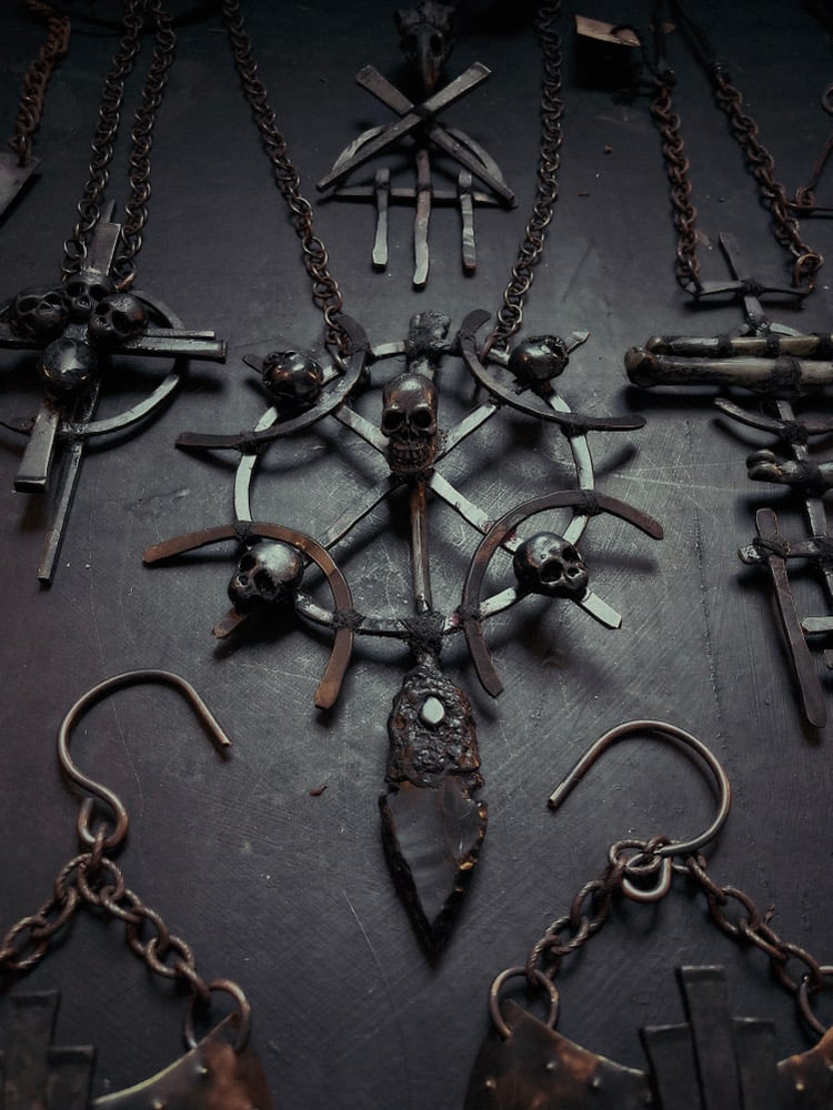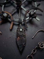 Hammered wire with mini skulls, on a long animal bone, with obsidian and garnet.