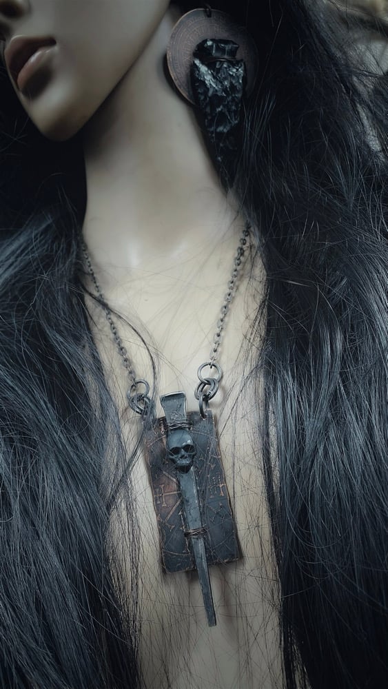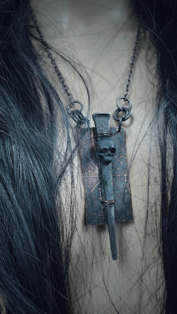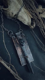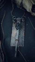 Acid etch on copper with antique coffin nail and skull. On copper chain.