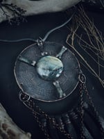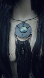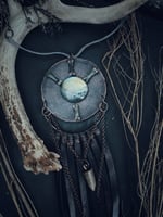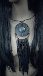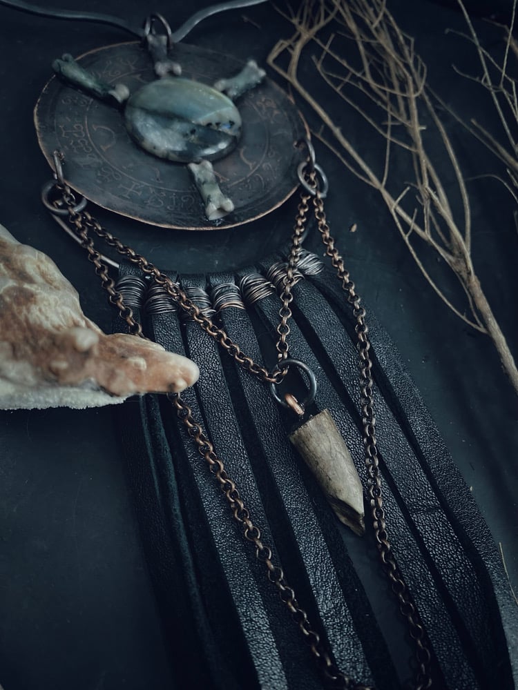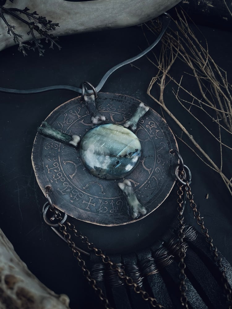 Acid etched on thick copper, with a flashy green labradorite, coyote toe-bones, an antler tip, and up cycled leather.