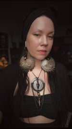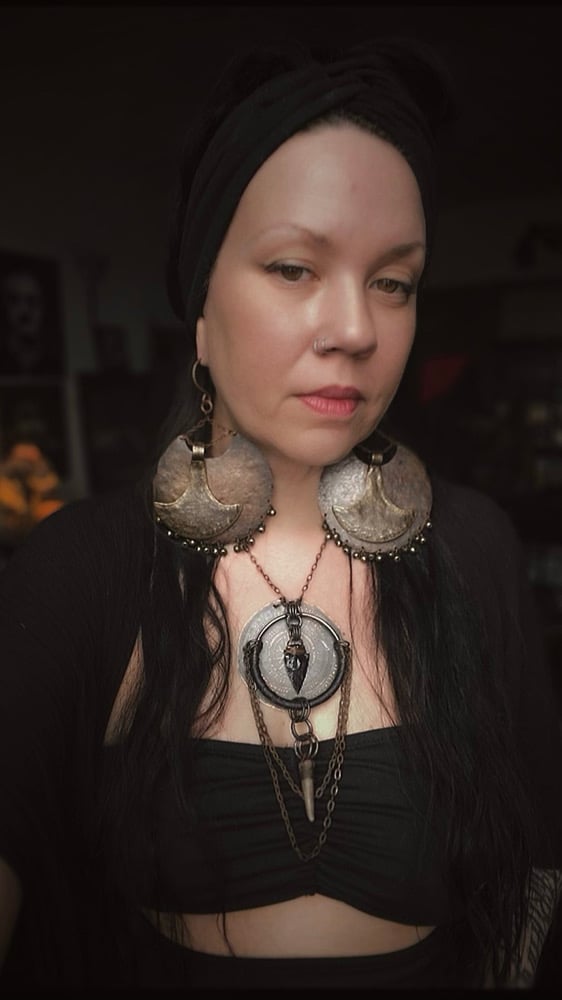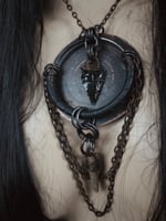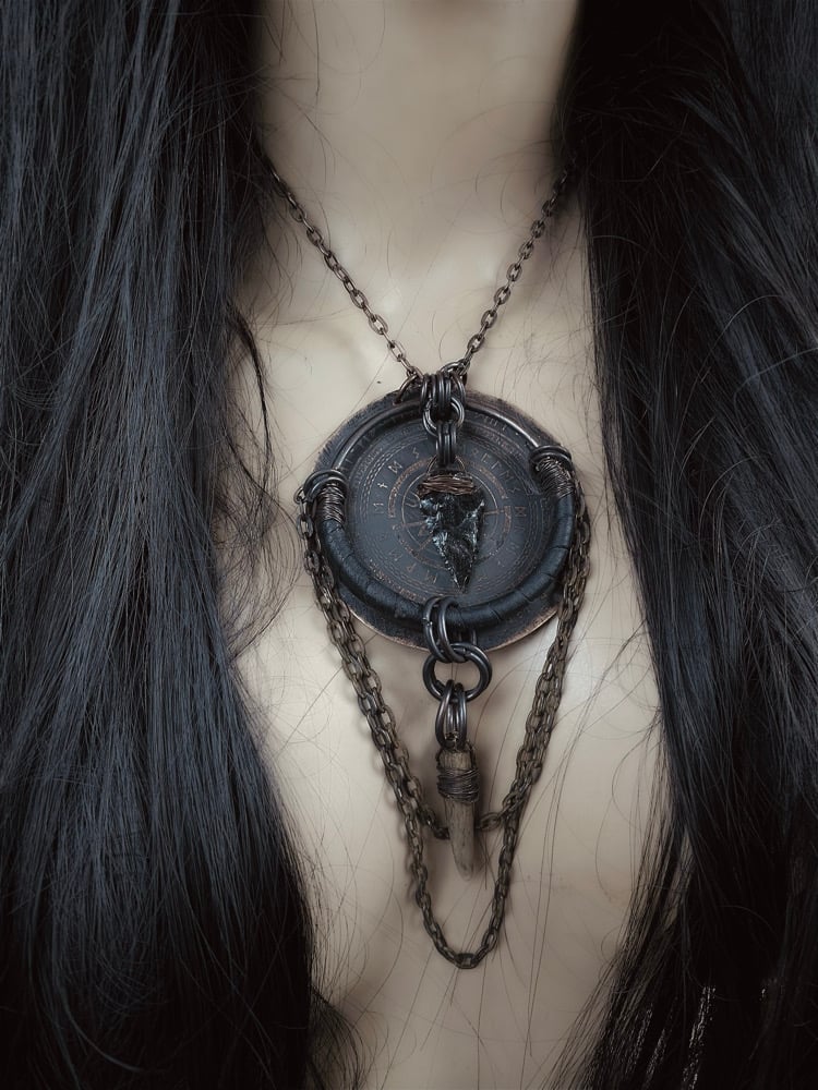 Acid etched on copper with leather, obsidian, copper chain and an antler tip. Lobster claw clasp