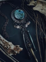 Acid etched copper with a huge flashy green Labradorite and three dangle bones, and chain.