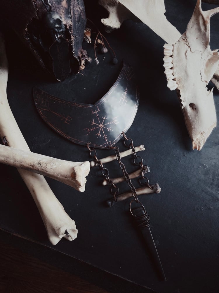 Hand cut and etched 24 gauge copper with coyote ladder bones and “rusty” coffin nail. Ties in back with extra long suede cording.
