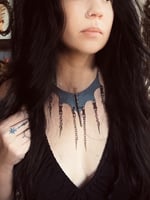 Hand cut copper batty with a tiny labradorite, tiny roadkill bones attached to chain. s loop closure in back.