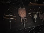Cut from 24 gauge raw copper, hand drawn and acid etched, with antique coffin nail and roadkill bones