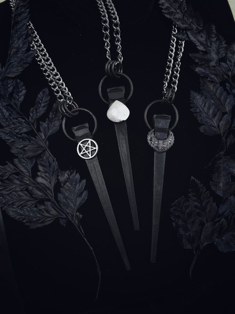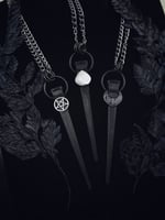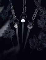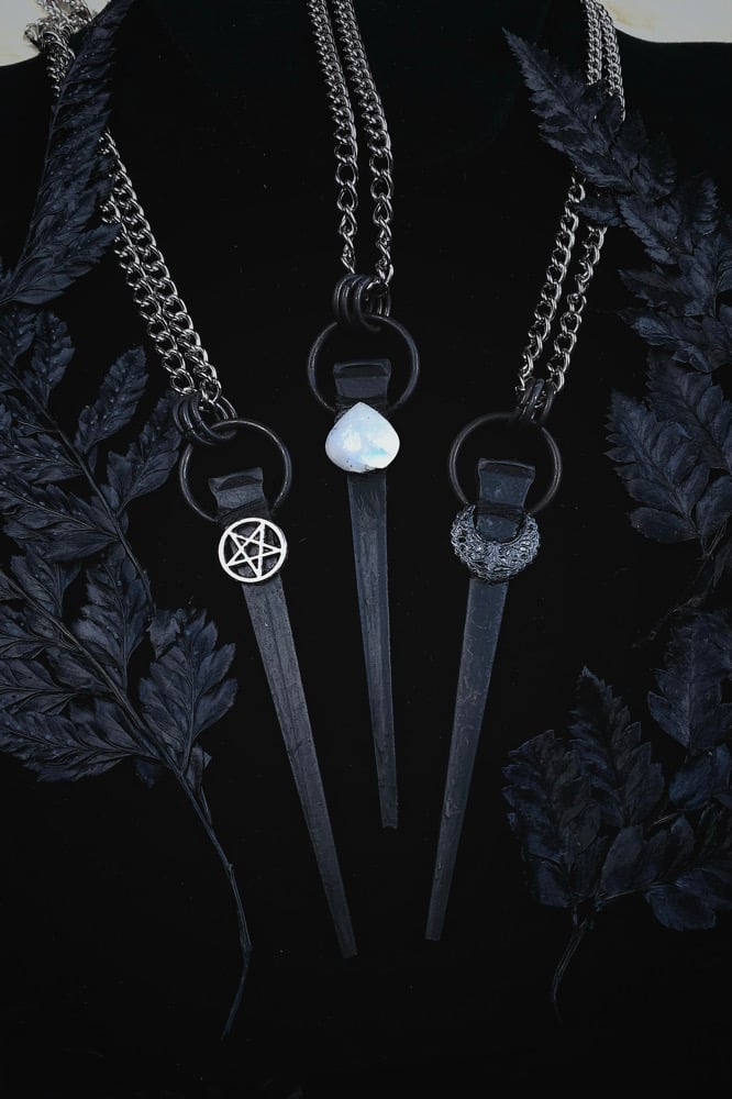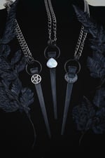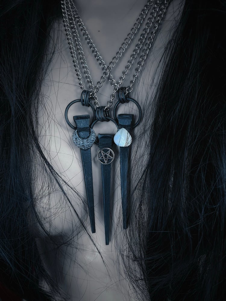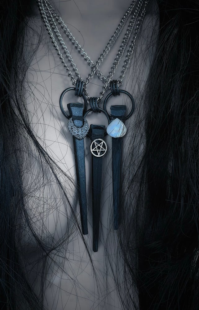 Set of 3 (or individual) antique coffin nails with moonstone, pentagram, and moon. All on heavy sterling silver chain, these have weight to them. Perfect for your small coven ✨
