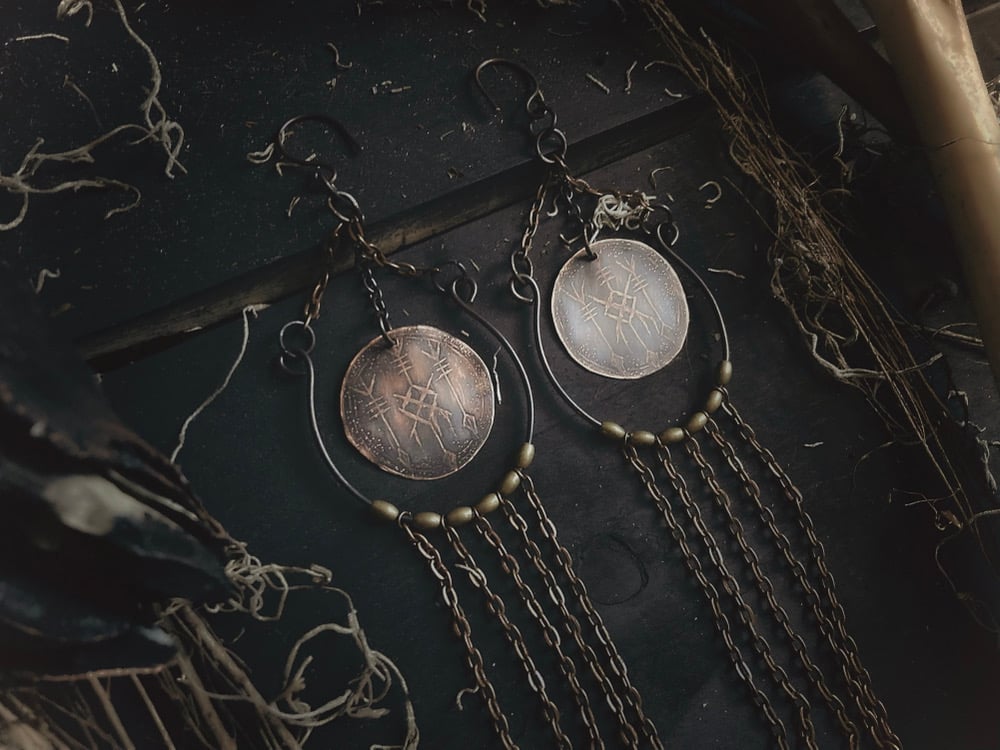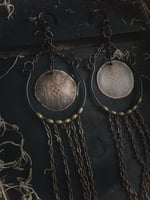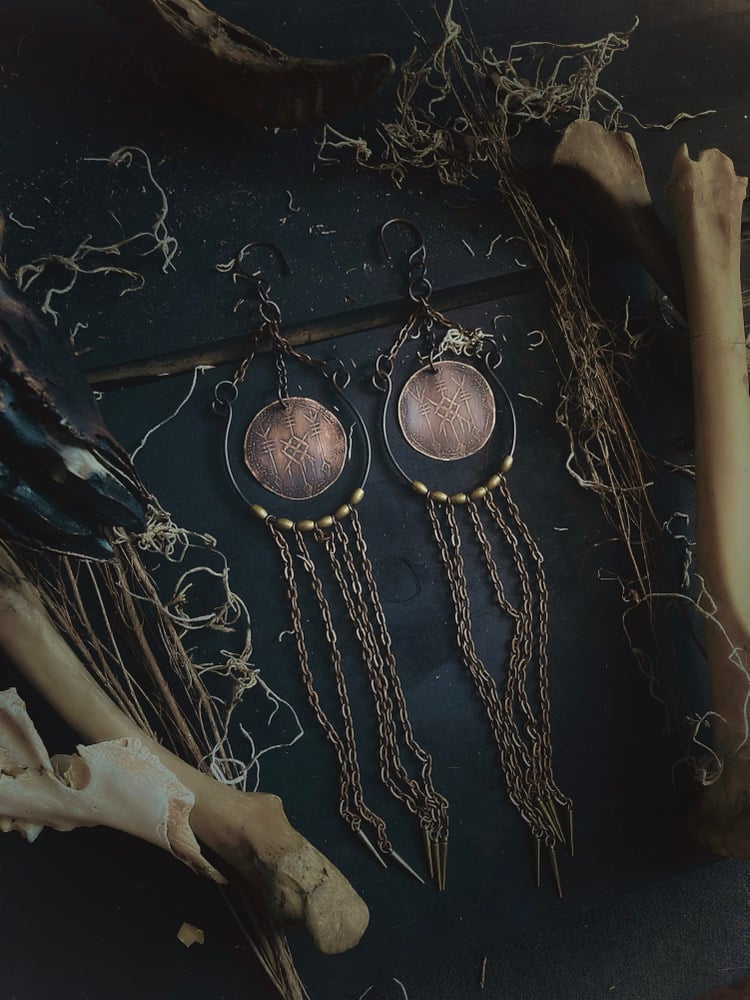 These are some serious statement hangers. Free mhand drawn and then edged copper with copper chains and brass beading.
