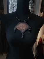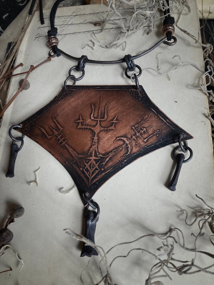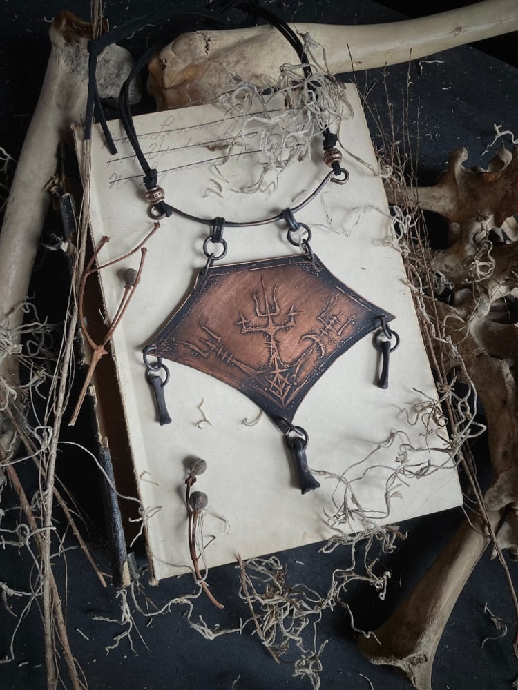 From cut copper I freehand drew and etched in acid this one of a kind design. Tiny roadkill bones adorn 3 peaks. Hung from black suede cording with copper beads.