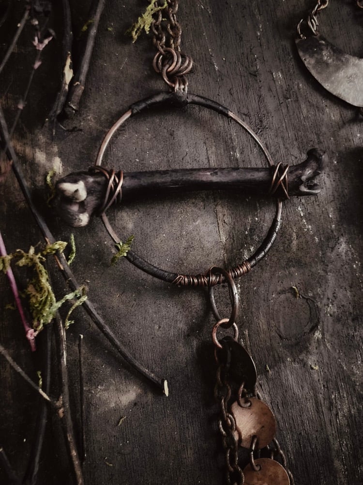 Large raccoon bone on hammered wire, with leather and wire wrap, copper coins, and chain.