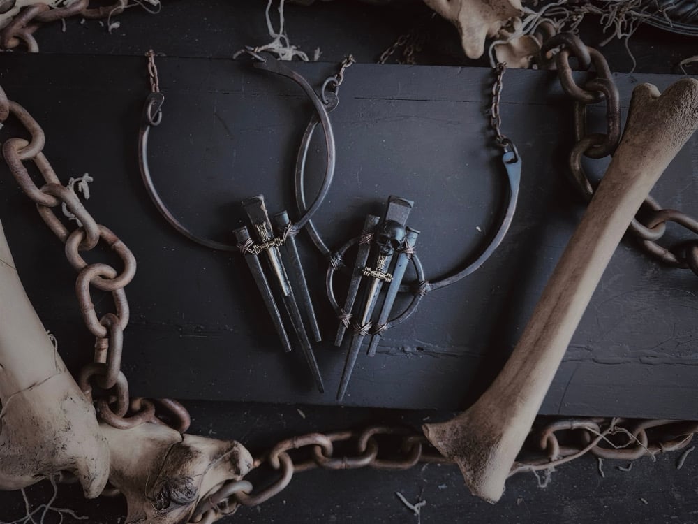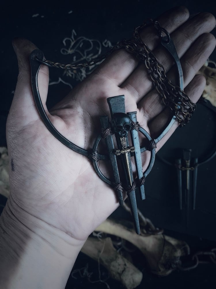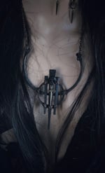 Forged copper with antique iron coffin nails, copper chain w lobster claw clasp. This piece is heavy and solid