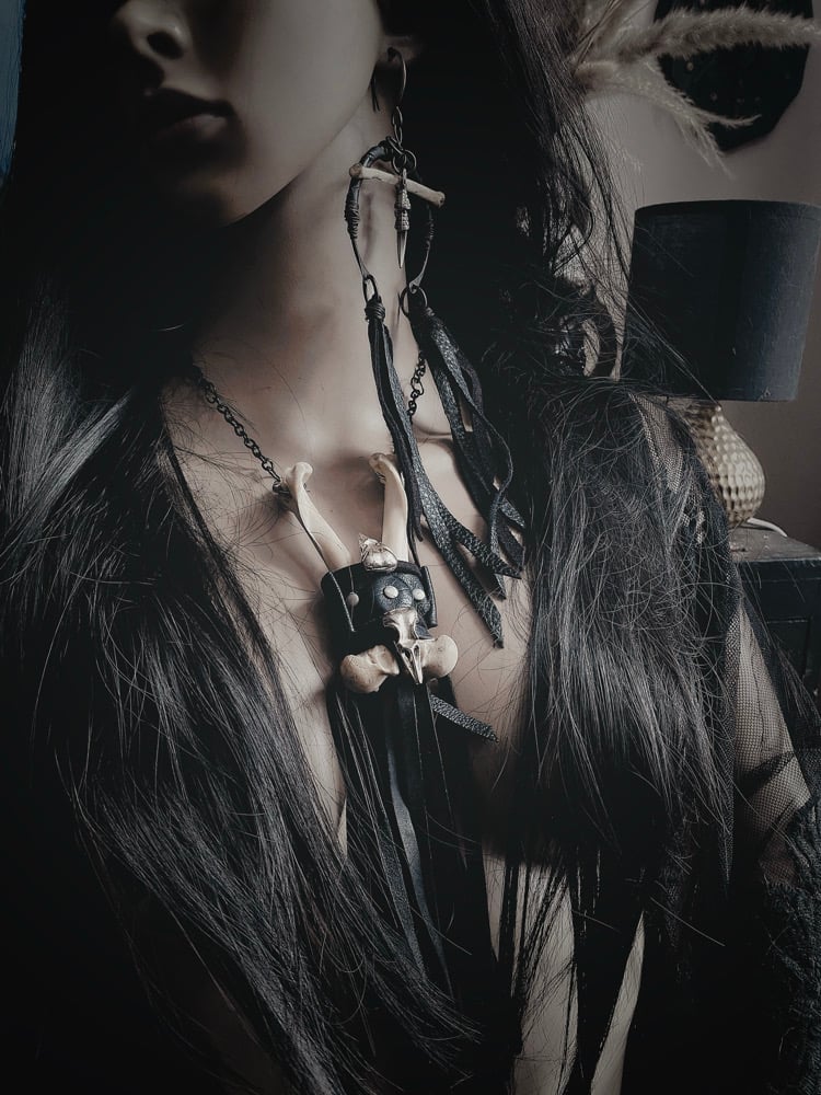 Nature found leg bones w wrapped leather and antiqued silver metal bird skulls