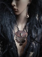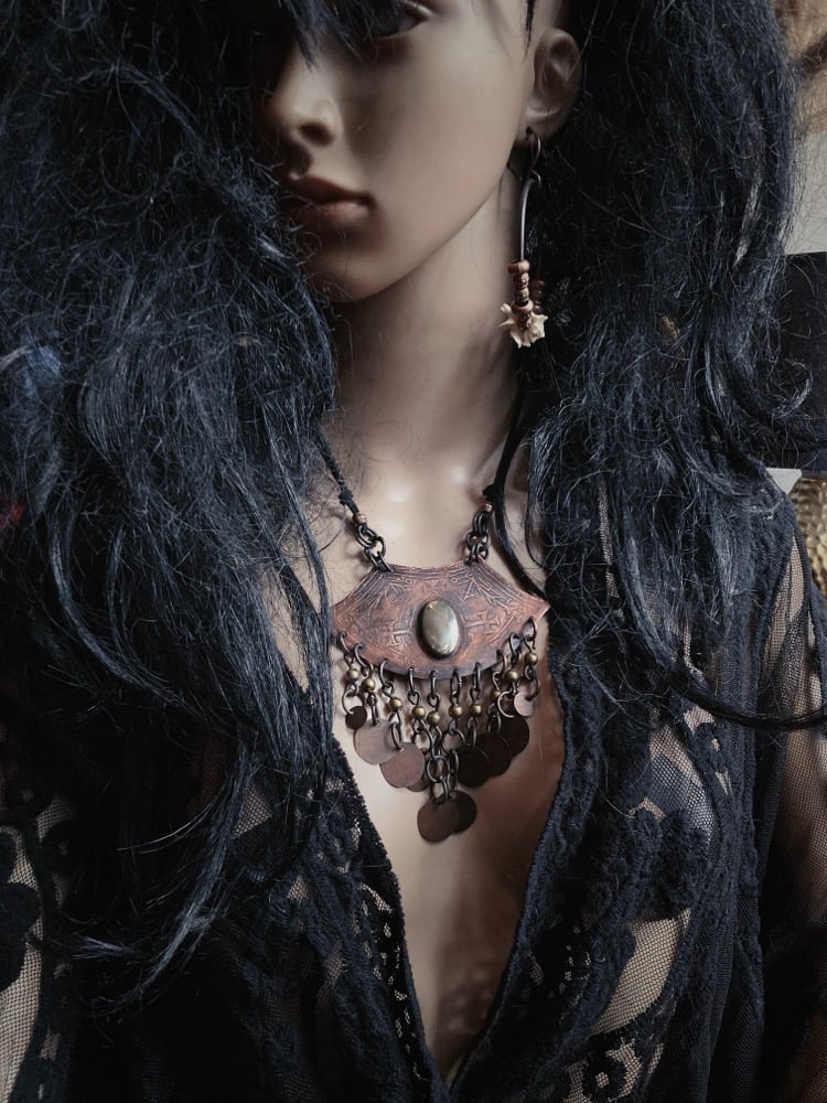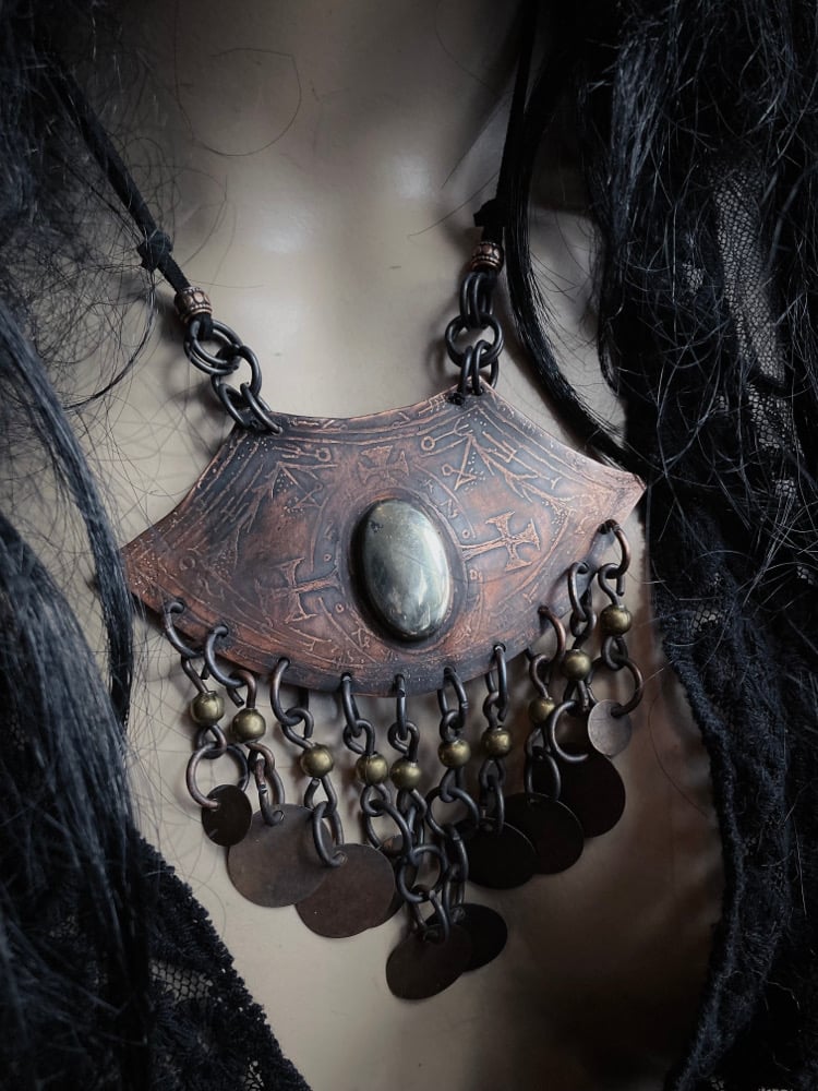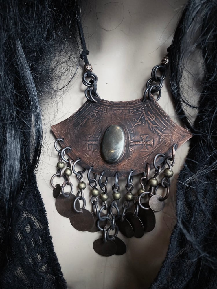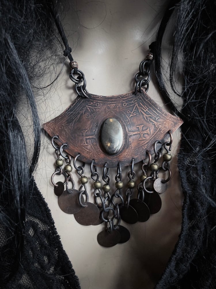Cut from 24 gauge copper sheeting, I freehand and etched this piece, with a gorgeous pyrite cabochon and copper beads and coins. Hung from suede cording