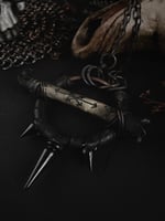 Leather wrapped copper with hand painted sigil roadkill bone and black spikes. Long copper chain