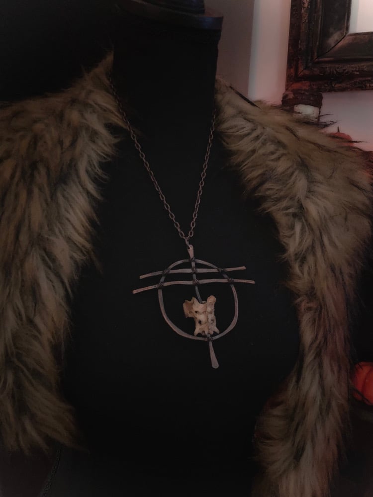 Hammered 10 gauge copper wire with feline roadkill sacrum bone